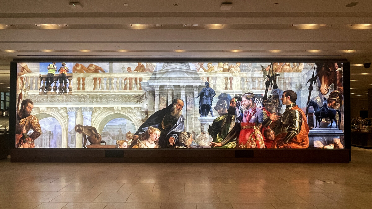 Our version of the painting also includes time-travelling, updating the scene once more to a contemporary Trafalgar Square, and treating the 21st century onlookers with playful humour as we see in Veronese's picture.